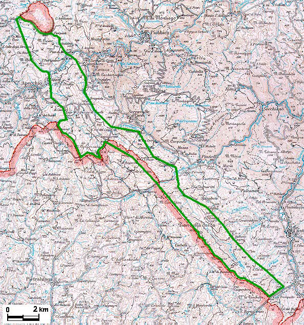 LOCALITA': gruppo montuoso allungato in senso N.O.-S.E. in parte sopra gli 800 m, comprendente il M. Vicino e il complesso delle Serre (partendo da N.O. Serra della Stretta, M. Soma, Serra di Acquapartita, Serra dei Castagni, Serriola, Serra di Caimarchi, Serra dell'Oncia, Serra di Ranco Bianco, Serra di Burano o Serra Maggio, M. Rosso)