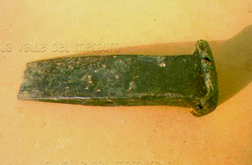 DESCRIZIONE: massiccio arnese in ferro, lungo 20 cm e largo 4,5 cm, con testa rettangolare e dalla parte opposta terminante a lama.