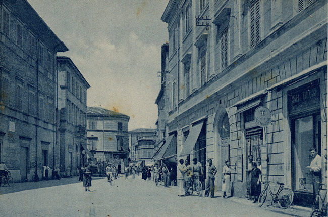Nella foto dei primi del 1900 si vede Porta Maggiore (detta allora Porta Mazzini) ancora collegata alle mura difensive adiacenti. Davanti stazionano alcuni passanti incuriositi e un uomo con un carretto a mano. Presso la casa posta all'incrocio tra la Via Flaminia e il Viale Umberto I (l'attuale Viale Gramsci) sosta un carro con cavallo protetto da una coperta sul dorso. Questo edificio era adibito a stallaggio con alloggio e al di sotto vi scorreva il canale che partendo dal Vallato del Porto portava l'acqua al Mulino di Porta Maggiore.