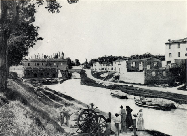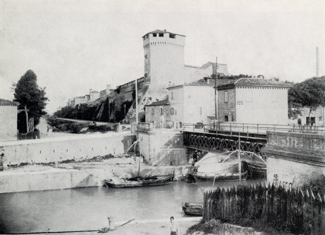 Nella foto dei primi del 1900 è visibile il ponte ferroviario in ferro che scavalca il porto canale. In acqua sono attraccate alcune barche e sporgono sollevate due bilance (reti da pesca). Sull'altra sponda domina la mole della Rocca Malatestiana, con il suo mastio. Addossate alla Rocca due case (tra cui il Mulino della Rocca) e accanto alla ferrovia il casello indicato col numero 155.