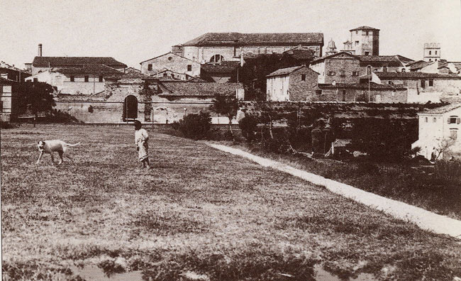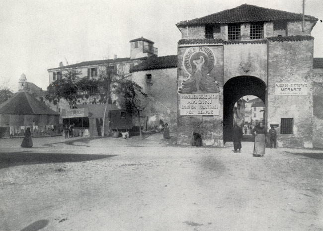 Nella foto dei primi del 1900 si vede la Porta San Leonardo (detta anche Porta Cavour), sulla quale sono affissi due manifesti pubblicitari: uno dell'Albergo-ristorante Miramare in via Montevecchio, l'altro della Ditta Annibale Magini sul "seme bachi". Si vedono alcune persone fuori e dentro la porta, tra cui una donna con scialle e paranansa (grembiule). Verso sinistra stazionano una giostra e un tiro a segno.