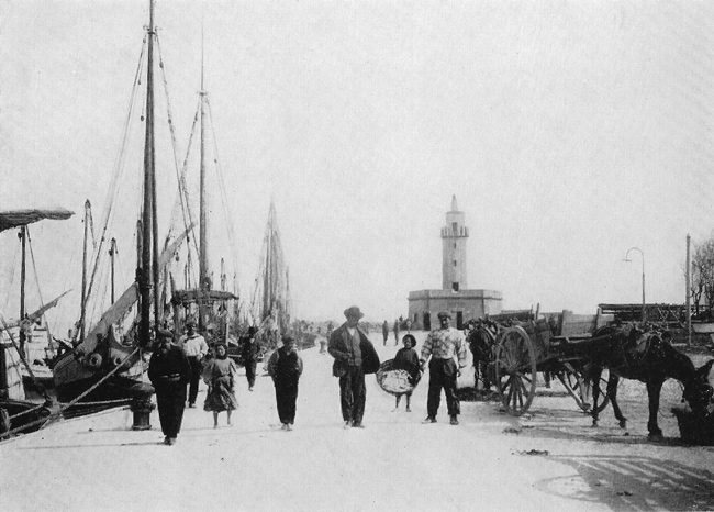 Nella foto dei primi del 1900 la banchina del porto che costeggia l'attuale Via Nazario Sauro è percosa da marinai ed altra gente. Un ragazzo mostra una cesta col pesce e un cavallo attaccato a un carretto si sta rifocillando. Al molo sono attraccati molti "barchetti" e sullo sfondo è visibile il faro (la Lanterna).