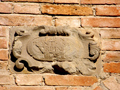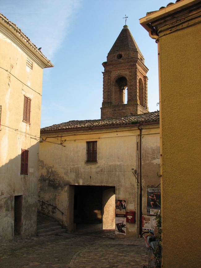L'edificio in cui si apre la porta, dotato di torre campanaria, è l'ex Palazzo Comunale.
