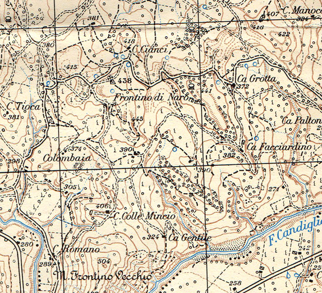 Frontino di Naro è situato sulle alture a circa 400 m di quota in sinistra idrografica del Candigliano, nei pressi di Abbadia di Naro.