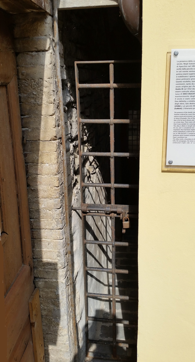 Un vicoletto, lungo 28 m e largo da 37 a 42 cm, separa il quartiere ebraico dal resto del paese. Venne costruito per sfuggire al pagamento di una ingente gabella (dieci ducati annui) decretata dal Papa Giulio III nel 1552, riguardante le sinagoghe e le case degli ebrei costruite attaccate a quelle dei cristiani, somma che andava a finanziare il mantenimento degli istituti che a Roma ospitavano gli ebrei convertiti.