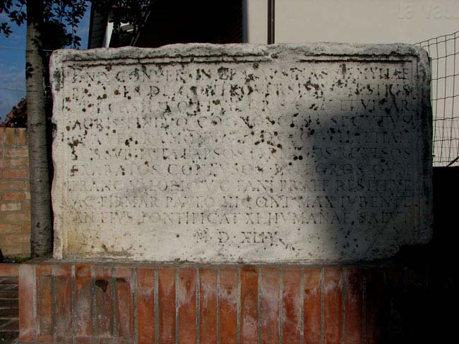 In Via Vecchia Osteria (bivio con Via Panzini) è collocato un blocco di pietra (cm 125 x 65 x 29) nel cui specchio è incisa una scritta che ricorda una controversia sul tracciato del confine fra il territorio di Fano, pertinente allo Stato Ecclesiastico, e quello di Mondolfo (Ducato d'Urbino). Dopo che il vecchio cippo era stato spiantato, il nuovo "termine lapidario" fu ricollocato, e ben fermato al giusto posto, nel 1544 per comando del Pontefice Paolo III. La ricollocazione fu curata da due personaggi ricordati nella epigrafe, Benedetto Conversini, vescovo di Jesi, presidente della Romagna e Francesco Valori, governatore di Fano. La scritta occupa undici righe; la terza è molto abrasa. Il blocco di marmo è ubicato sul ciglio della strada, in curva, e protetto da una struttura in mattoni. Il cippo marmoreo è stato restaurato nel 1999.