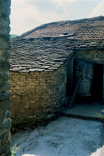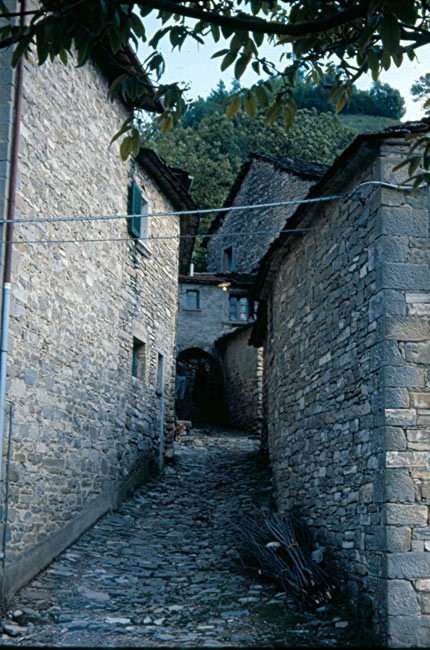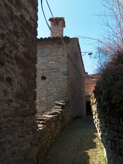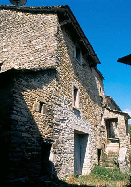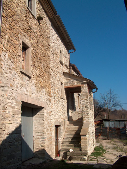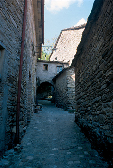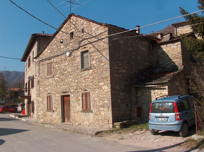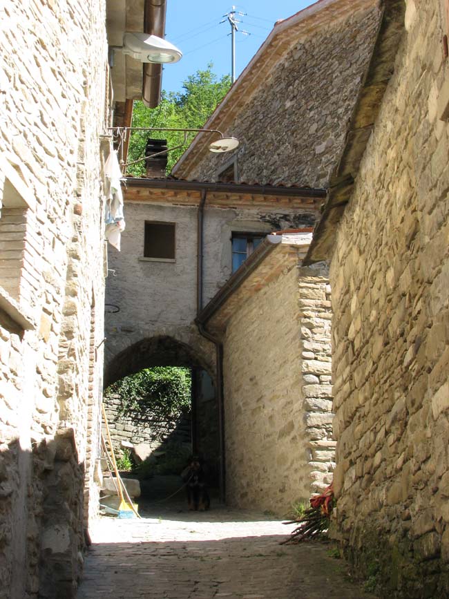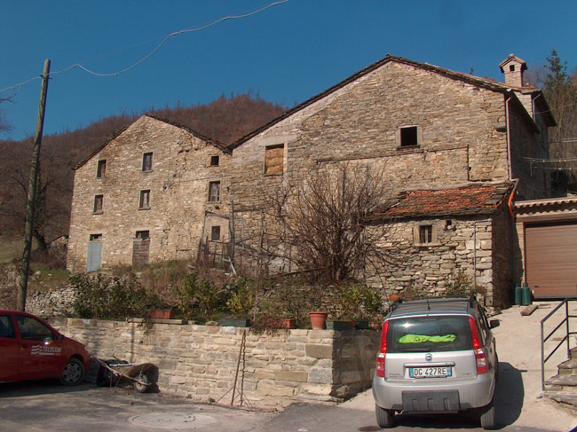 I pochi abitanti del paese occupano case antichissime, costruite con conci di pietra arenaria e ricoperte da caratteristici tetti a lastre spioventi, pure di arenaria, anche se nei restauri sono state spesso usate tegole in laterizio. Altre case in stile rinascimentale tosco-marchigiano, situate nella zona, dimostrano come notevoli siano gli influssi culturali provenienti dalla vicina Toscana.