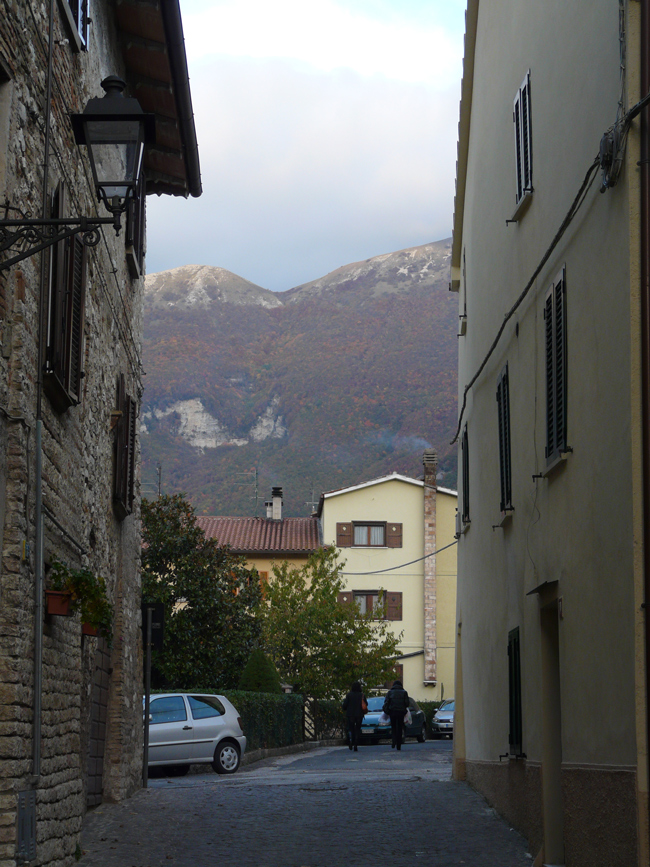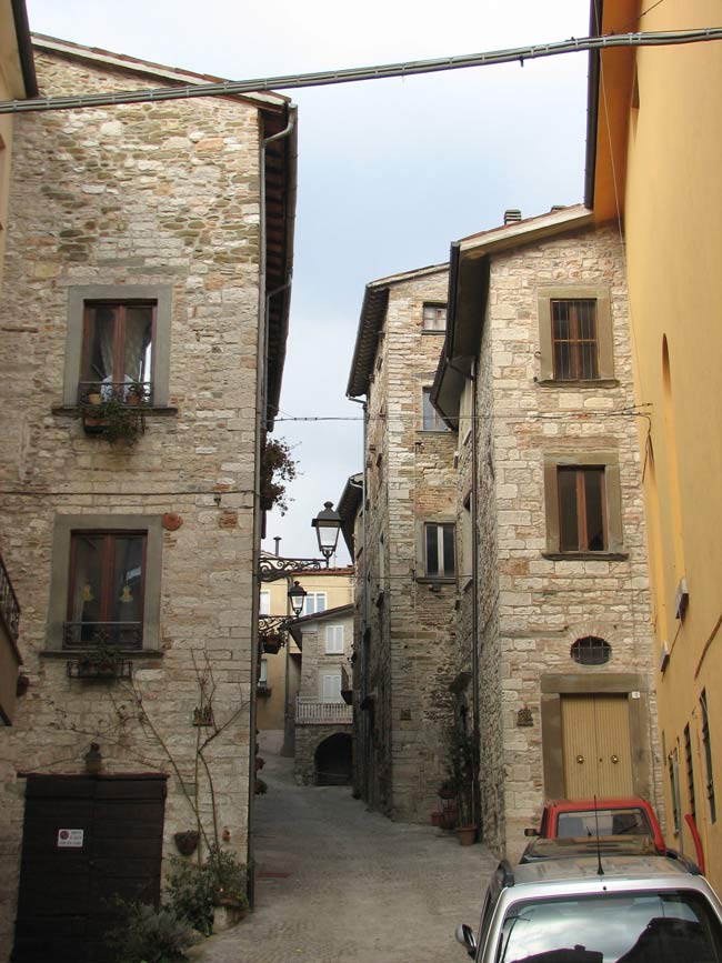 Il paese di Cantiano mantiene nel suo centro storico un severo aspetto medievale, soprattutto nel prospetto della via Fiorucci, dove si staglia il duecentesco palazzo Corsi con archi a sesto acuto e portali in bugnato.