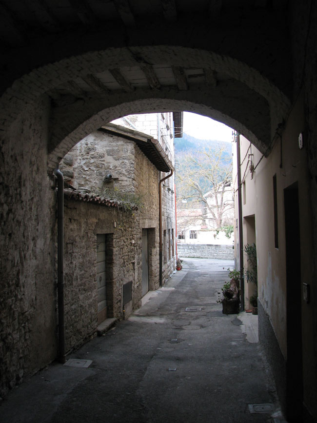 della parete lungo via Mazzini. Poco più avanti la Chiesa Collegiata dedicata