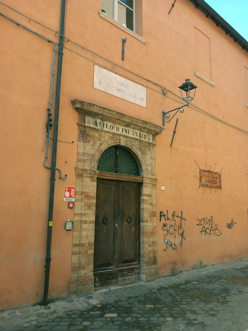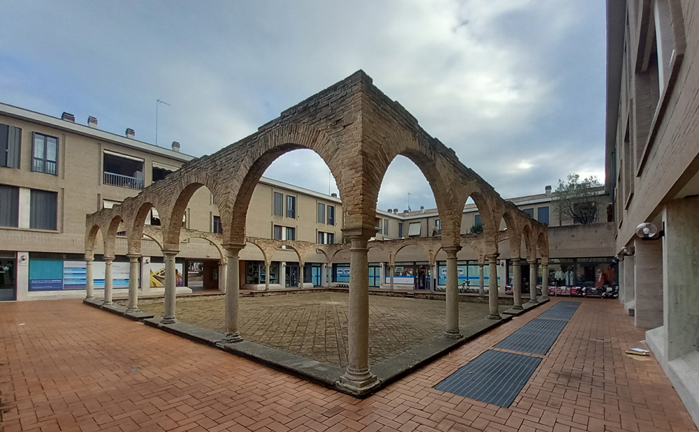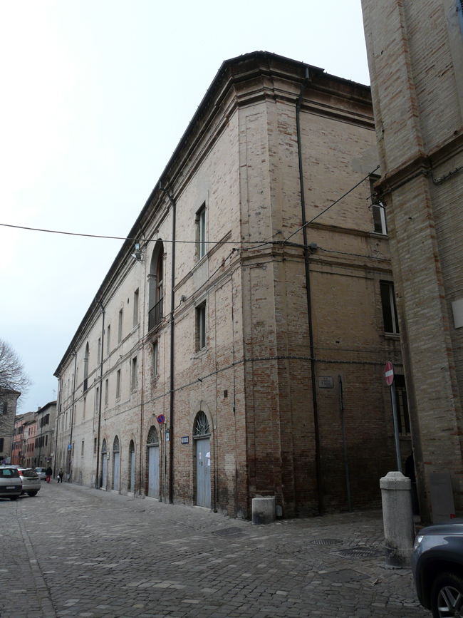 Il chiostro seicentesco del Monastero di Santa Teresa, situato nell’area tra il Corso Matteotti e la Rocca Malatestiana, venne inglobato a fine XIX secolo nella Caserma Montevecchio quando questa prese il posto del Monastero. Le monache costruirono allora una nuova sede in Via Gabrielli, in quel tempo fuori città. Dopo che la caserma venne demolita alla fine degli anni ’50 del secolo scorso perché fatiscente, il chiostro stava per subire nel 1970 la stessa sorte. Il chiostro è stato poi preservato ed è ora compreso in uno spazio del complesso residenziale costruito sul posto e terminato nel 2002.
