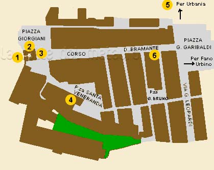 Il centro antico, il cosiddetto Pianello, si sviluppa attraverso i vicoli che decorrono in direzione ortogonale rispetto al corso principale e comprende via Acqualagnini, che corre parallela a Corso Bramante.