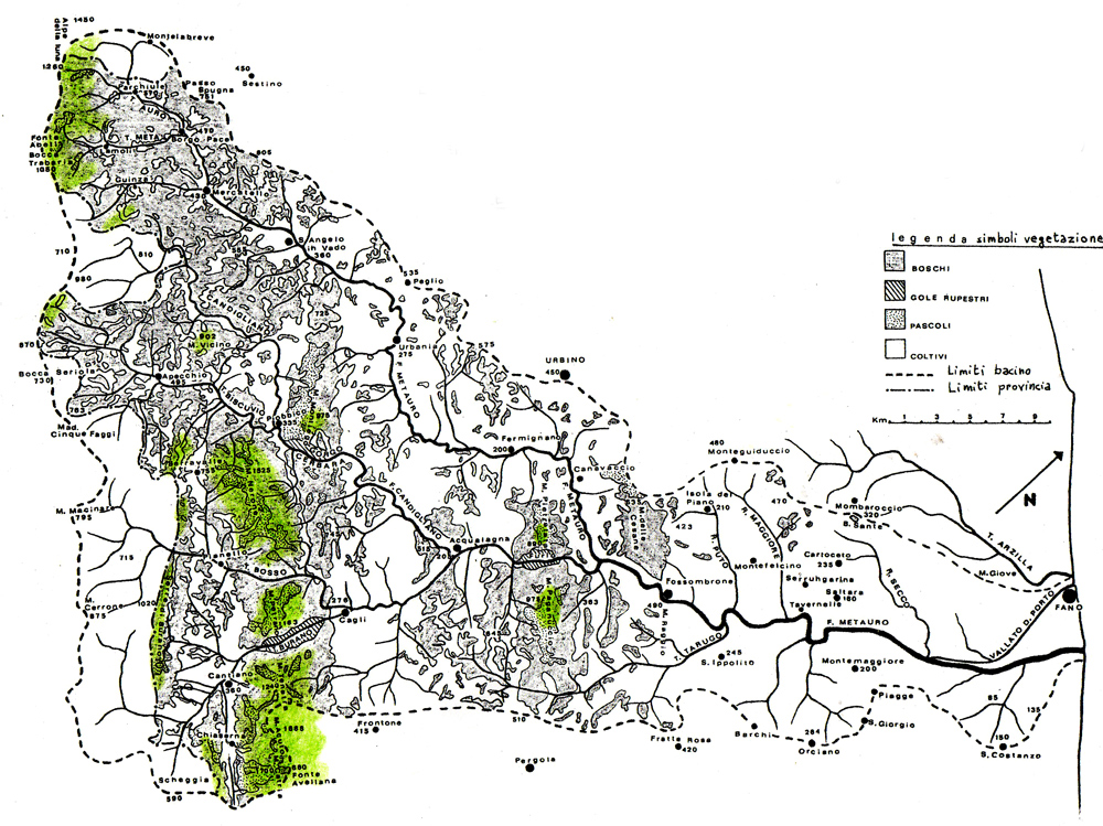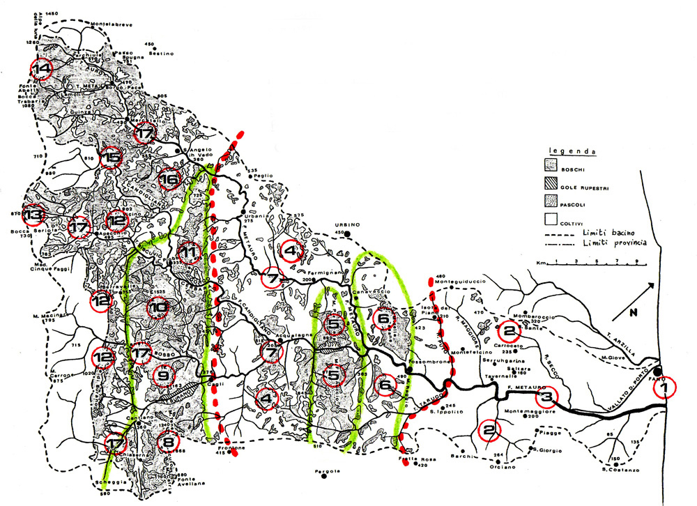 - il medio bacino, dal Rio Puto - T. Tarugo alla linea S. Giovanni in Petra - Cagli, da 75 m a quasi 1000 m di quota (M. Paganuccio dei Monti del Furlo). Comprende la zona collinare interna o alto-collinare, la Dorsale Marchigiana (coi Monti del Furlo, della Cesana e M. Raggio-Montalto Tarugo) e la media valle - medio corso del Metauro e dei suoi affluenti (Candigliano e Burano);