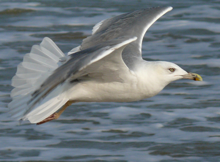 Dati accertati nella zona di studio (bacino del Metauro e litorale di Fano): stato fenologico: specie migratrice e svernante, presente anche d’estate ma senza nidificare (M, W). Frequenza di osservazione: comune. Osservazioni: basso bacino: rilevamenti dal 1979 al 2025. Frequenta le acque marine costiere e il porto di Fano, i laghetti di escavazione lungo il Metauro e la discarica comunale di rifiuti nella zona collinare di Monte Schiantello a sud di Fano, non lontano dalla costa. Compare a fine giugno-primi di luglio, aumentando la sua presenza in autunno e soprattutto in inverno, per poi tornare da metà febbraio alle sue colonie riproduttive. Sono da confermare notizie di recenti sue nidificazioni sopra capannoni industriali e nel centro storico di Fano, dove se ne è registrata varie volte la presenza in periodo riproduttivo. Osservato con alcuni esemplari posarsi abbastanza di frequente sulla sommità di edifici della periferia urbana a circa 1,5 km dalla spiaggia anche in periodi di mare calmo (nel 2024 e nell'aprile-giugno 2025, POGGIANI). Il 29 giugno 2025 osservati 2-3 giovani appena involati nella periferia sud di Fano, posati a terra in un parcheggio (CAVALIERI, com. pers.).