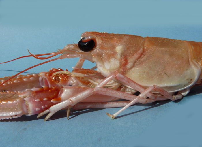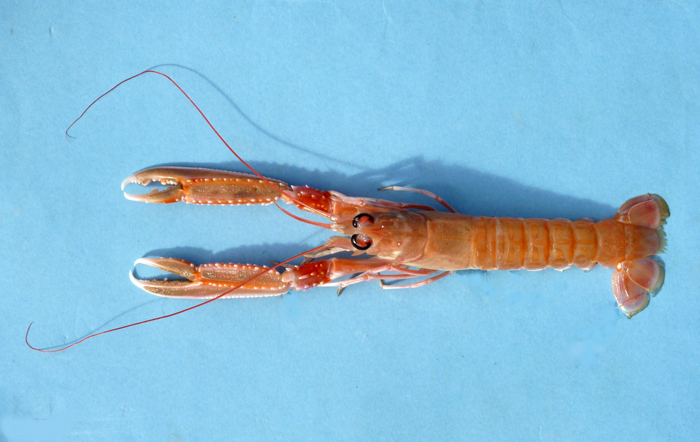 Caratteri distintivi: lunghezza totale 240 mm. Chelipedi lunghi e con carene dentellate nel propodio. Colore rosato con zone rosso-arancio.