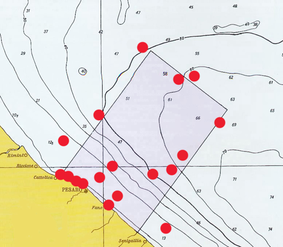 Dati accertati nella zona di studio (Adriatico antistante la Provincia di Pesaro e Urbino sino a 34,5 miglia al largo): tipo di dati: osservaz. esemplari conservati, dati bibliografici. Frequenza di osservazione: specie comune. Pescata in diverse stazioni dai 3 ai 10 m di prof. nel fondale sabbioso-fangoso al largo della costa alta del San Bartolo da Pesaro a Gabicce (PICCINETTI, 1978). Pescata nel 1982 al largo di Fano in 4 stazioni di rilevamento a 15-16 m di prof. nel fondale fangoso-sabbioso costiero, a 50 m in quello fangoso e a 56-64 m in quello sabbioso-fangoso/fangoso molto sabbioso ricco di epifauna (campagna PIPETA, in ŠIMUNOVIĆ A., 1997). Un esemplare di 52x63 mm pescato nel marzo 2008 circa 36 miglia al largo di Fano a circa 60 m di prof., nel fondale fangoso molto sabbioso ricco di epifauna (CIABOTTI, com. pers.). Pescata in 7 campionamenti dal 2008 al 2012 al largo di Pesaro a 60 m di prof. presso le piattaforme Annalisa A e B, nel fondale sabbioso-fangoso ricco di epifauna (FABI et al., 2016b). Diversi esemplari pescati a 1,5 miglia al largo di Fano, nel marzo 2011. Pescata nel 2011 e 2012 in 5 stazioni di rilevamento nel tratto da Cattolica alla foce del Cesano da circa 15 m a circa 55 m di prof., nel fondale fangoso-sabbioso costiero e più al largo nel fondale fangoso e in quello sabbioso-fangoso/fangoso molto sabbioso ricco di epifauna (campagne SOLEMON, con dati utilizzati in SANTELLI et al., 2017). Rinvenuta di frequente spiaggiata lungo la costa fanese (osservaz. ripetute dal 1990 al 2018 - POGGIANI). Si trova nel pescato delle barche che operano sui fondali fangoso-sabbiosi al largo della Provincia di Pesaro e Urbino e arriva a volte nelle pescherie fanesi.