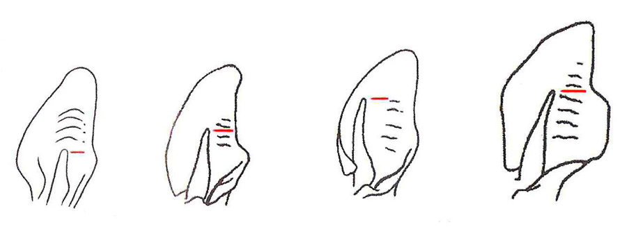 Caratteri distintivi: lunghezza testa-corpo in gen. 49-51 mm, avambraccio in gen. 38-40 mm. Orecchio abbastanza corto, con 4-5 pieghe trasversali e trago (1) lungo e appuntito, con punta che non arriva alla metà dell’altezza del padiglione (in Myotis nattereri oltrepassa la metà dell’altezza - vedi figura). Colore dorsalmente bruno-grigio e ventralmente più chiaro.