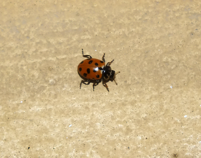 Morfologia: lunghezza 3-6 mm. Corpo ovale. Pronoto giallo pallido decorato da macchia nera caratteristica a forma di maschera. Elitre arancioni. Specie estremamente variabile nel numero dei punti neri presenti sulle elitre (da 0 a 13).