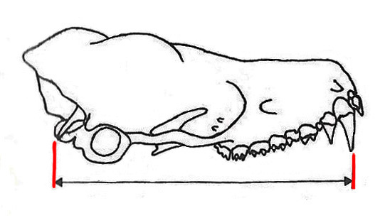 (1) Misura della lunghezza condilo-basale: lunghezza del cranio misurata tra l’estremità anteriore del premascellare e quella posteriore del condilo occipitale.