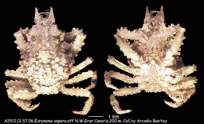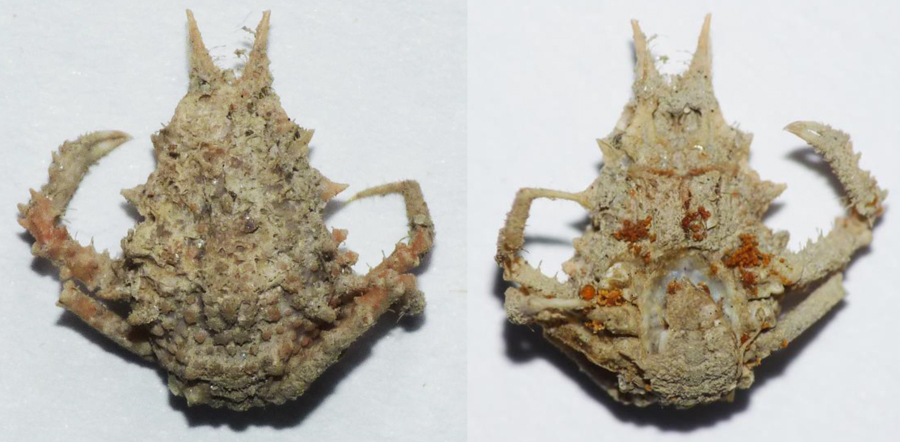 Caratteri distintivi: lunghezza del carapace 20 mm. Rostro formato da due spine divaricate e leggermente arcuate verso l’esterno, separato dalla protuberanza preorbitaria da una marcata fessura. Carapace cosparso da tubercoli a forma di fungo, chelipedi più lunghi nel maschio, con diversi tubercoli e spine. Colore rossastro o marrone.