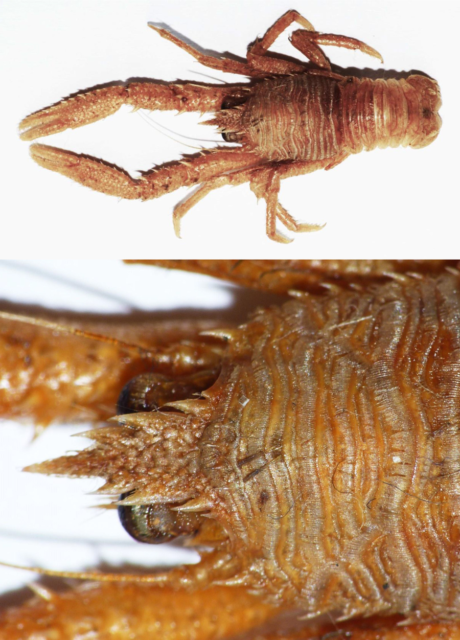 Caratteri distintivi: lunghezza totale 35 mm (ZARIQUIEY ALVAREZ, 1968). Articolo basale del peduncolo antennulare con 3 spine (vedi disegno). Rostro triangolare, con peluria e 4 denti per lato (vedi disegno). Antenne lunghe e filiformi. Chelipedi lunghi e V pereiopodio più piccolo degli altri. Addome ripiegato ventralmente fin sotto il torace, ma senza ricoprirlo per intero. Colore rossastro, a volte con macchie bianche (mai blu).