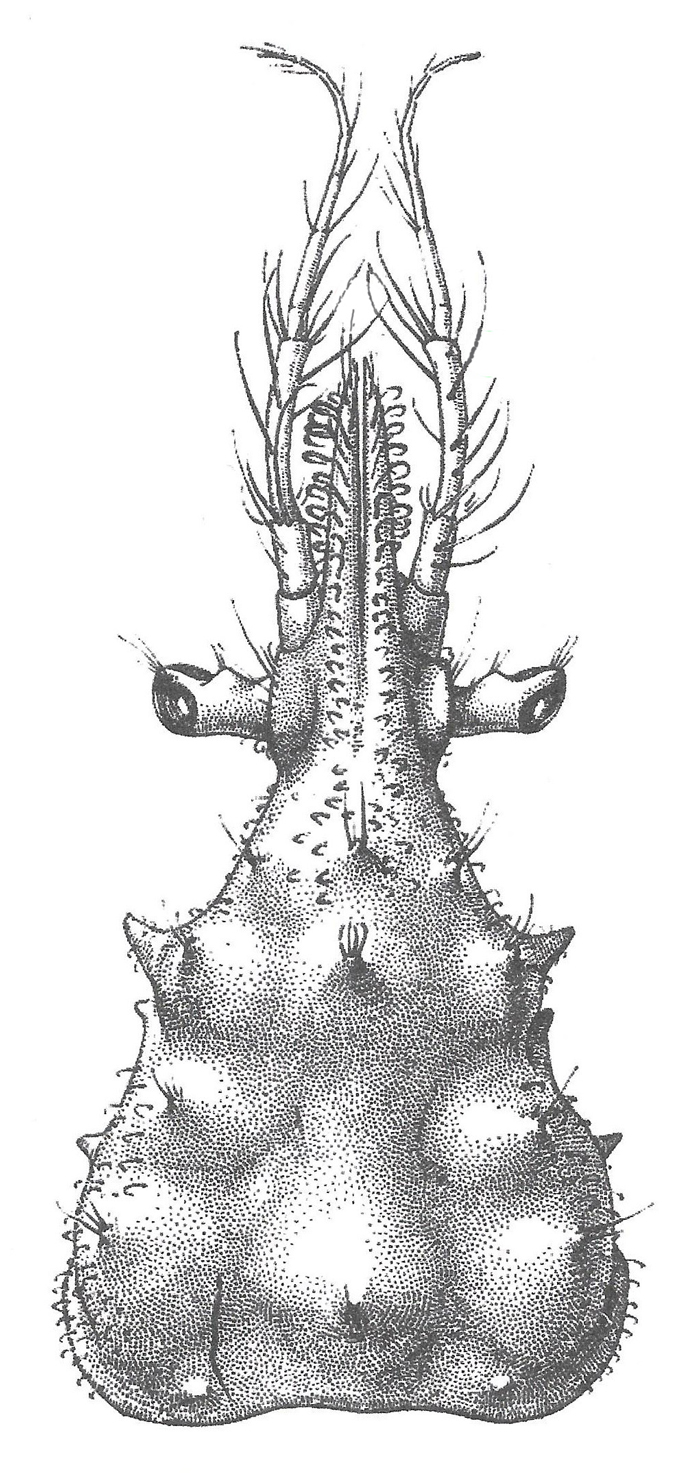 Caratteri distintivi: lunghezza-larghezza del carapace 11x6 mm. Rostro formato da due spine lunghe e contigue, che non oltrepassano l’apice del V articolo antennale e coperte da setole uncinate. Carapace più largo posteriormente, con spine e tubercoli. Pereiopodi molto lunghi e sottili, chelipedi più corti di questi.