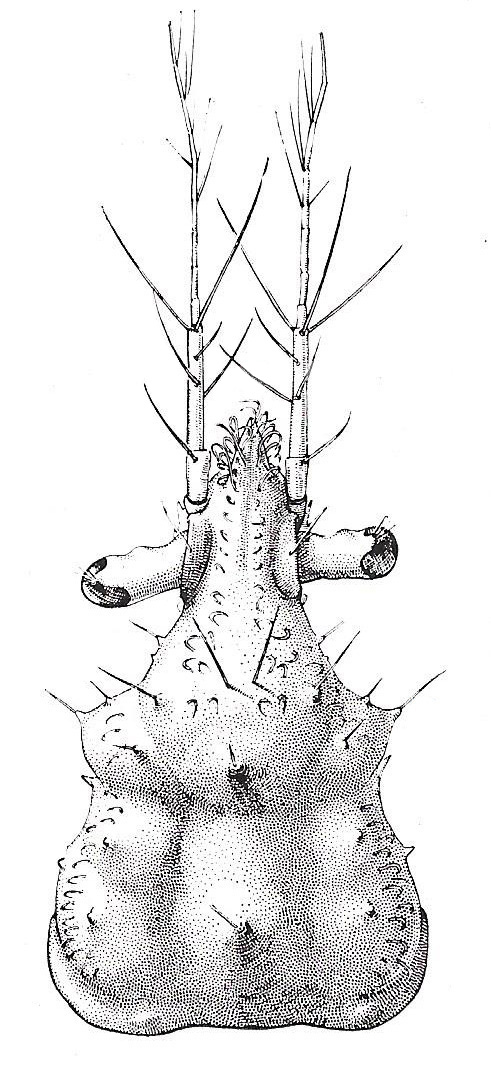 Caratteri distintivi: lunghezza-larghezza del carapace 10,5x6 mm. Rostro formato da due spine corte e contigue, che oltrepassano appena la base del V articolo antennale e coperte da setole uncinate. Carapace più largo posteriormente, con spine e tubercoli. Pereiopodi molto lunghi e sottili, chelipedi più corti di questi.