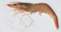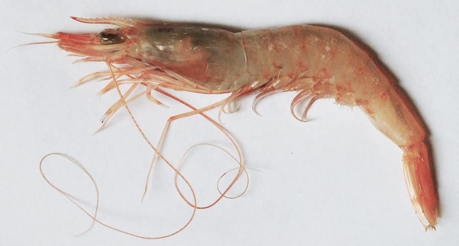 Caratteri distintivi: lunghezza totale 160-190 mm. Rostro rivolto all’insù verso la punta, privo di denti sul bordo inferiore (carattere distintivo rispetto agli altri Penaeus) e con 7 denti sul bordo superiore più un altro dente distanziato dagli altri lungo una carena mediana sul carapace. Prime tre paia di pereiopodi che terminano con una pinza. Colore rosa e aranciato. Aspetto inconfondibile.