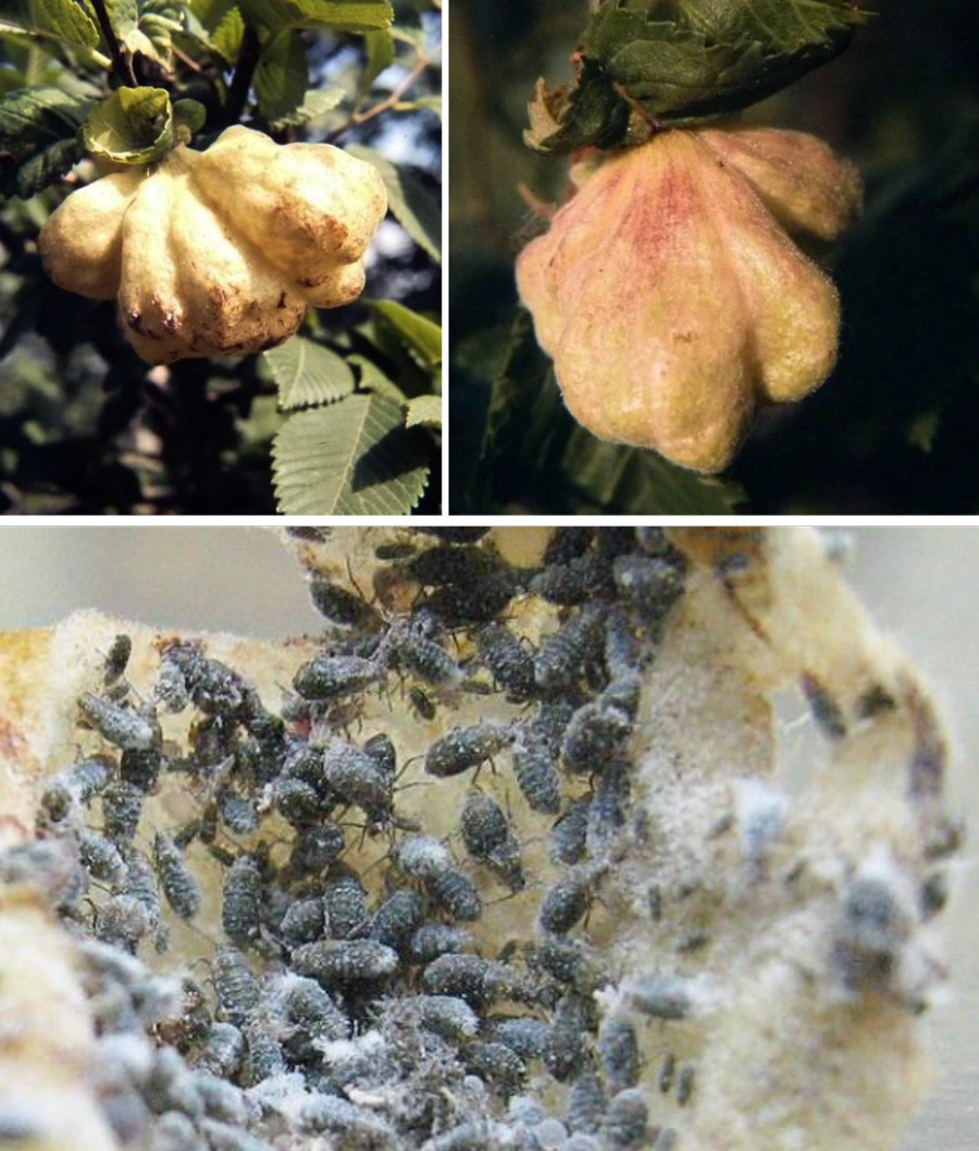Ecologia e biologia: le galle prodotte da questo afide crescono sulle foglie degli olmi e sono a forma di borsa irregolare, grande anche 10 cm e dapprima di colore verde. All’interno contengono numerosi afidi assieme a gocce di liquido zuccherino. In giugno diventano gialle e rossicce, si fessurano lasciando uscire gli alati migranti e infine una volta disseccate diventano scure e rigide. Il ciclo continua sulle radici del Pero (Pyrus communis), per poi ritornare all’Olmo (Ulmus sp.pl.).
