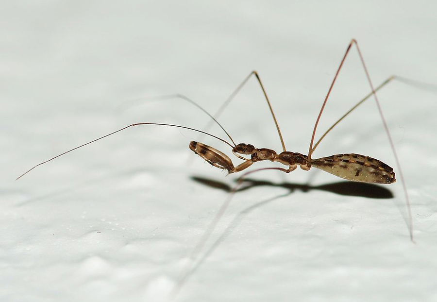 Morfologia: lunghezza 5 mm circa. Antenne e arti filiformi e primo paio di zampe di tipo raptatorio per catturare le prede.