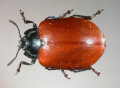 Morfologia: lunghezza 10-12 mm. Corpo largo, tozzo, piatto di sotto, molto convesso di sopra, glabro e lucido. Colore nero con riflessi bluastri, elitre rosse con una macchietta nerastra all’apice. Capo molto più largo che lungo, di sopra piatto, con punteggiatura sottile; occhi grandi, ellissoidali; antenne corte, di 11 articoli, gli ultimi 5 finemente pelosi e ingrossati, il 1° ingrossato. Pronoto ribordato, poco convesso, molto più largo che lungo, con punteggiatura più forte verso gli angoli posteriori e presso due depressioni longitudinali laterali; margine anteriore molto incavato e più stretto del posteriore; margini laterali arrotondati, margine posteriore molto arrotondato e sporgente verso lo scutello; angoli anteriori molto sporgenti, ma arrotondati; angoli posteriori quasi retti. Elitre tozze, con la massima larghezza dopo la metà, con forte e fitta punteggiatura irregolare; margini laterali paralleli nella metà anteriore, poi arrotondati; omeri evidenti, ma largamente arrotondati. Zampe robuste; tarsi di 4 articoli, il terzo bilobo.