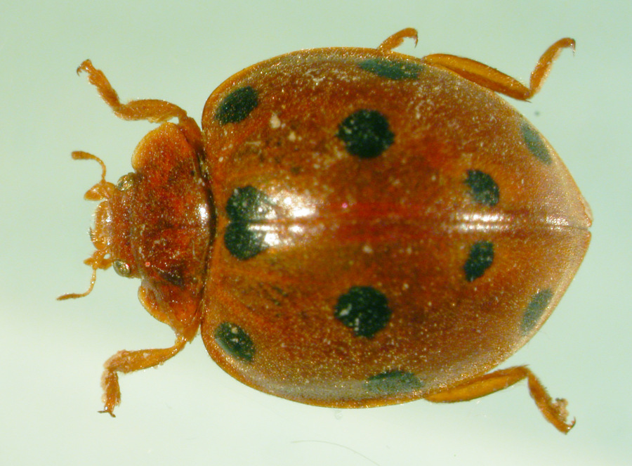 Caratteri distintivi: dimensioni 7-9 mm. Coccinella facilmente distinguibile per le dimensioni grandi e la colorazione molto appariscente. Corpo semisferico, di colore giallo-arancio con 12 grandi macchie nere, 6 per ogni elitra.