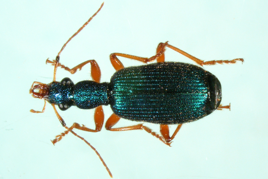 Morfologia: lunghezza 7-9 mm. Corpo allungato, convesso, pubescente, con punteggiatura fittissima e profonda. Colore blu o verde-blu; apparato boccale, antenne e zampe giallo-rossicci; estremità del 1° antennomero e un anello del 2° nericci. Capo molto allungato con occhi sporgenti, labbro superiore prominente e una protuberanza sovrastante l’inserzione delle antenne; mandibole snelle, con lati quasi diritti e uncinate all’estremità; antenne lunghe, con 11 antennomeri di cui il 1° lungo quanto i 3 seguenti presi assieme. Pronoto stretto, quasi cilindrico, più stretto della testa, non ribordato ai lati, lievemente arrotondato al margine anteriore e con una leggera concavità davanti alla base; margine posteriore poco più largo della strozzatura mesotoracica. Elitre grandi, con base stretta e omeri sfuggenti, con la massima larghezza dietro la metà, leggermente concave ai lati dopo il terzo anteriore e, all’apice, troncate, con 8 strie fortemente punteggiate oltre alla stria scutellare e a quella marginale; alata. Zampe molto lunghe; femori claviformi; tarsi con 5 articoli di cui il 4° bilobo, nei maschi i 3 primi articoli debolmente dilatati.