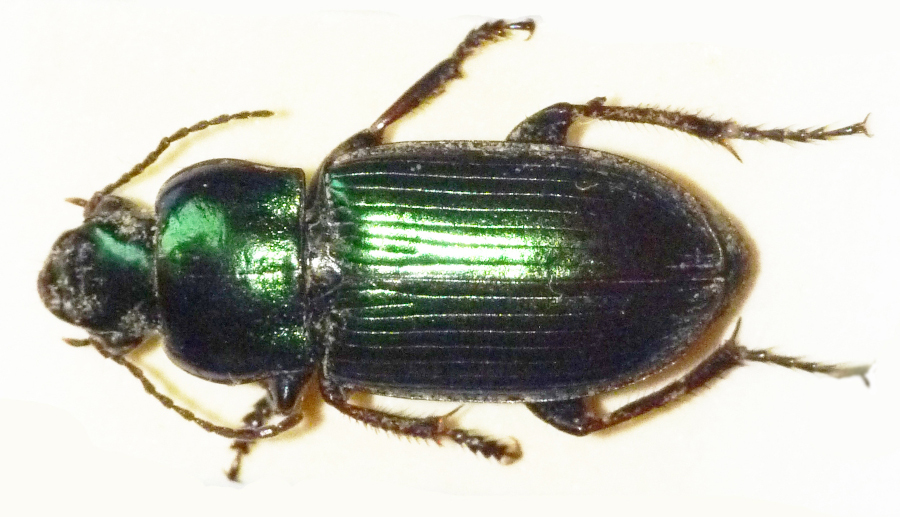 Morfologia: lunghezza 9-11 mm. Corpo poco allungato, glabro. Colore estremamente variabile, verde, cupreo, di rado azzurro o nerastro, con riflessi metallici; antenne parzialmente annerite dal 2° articolo in poi; zampe nere. Capo liscio, ad ogni lato con una fossetta frontale larga e superficiale presso la base delle antenne; occhi sporgenti; antenne di 11 articoli, non molto lunghe. Pronoto molto più largo che lungo, con un solco longitudinale mediano, e, alla base, con punteggiata estesa, ma concentrata soprattutto in corrispondenza delle 2 ampie aree laterali incavate; margini anteriore e posteriore diritti e ribordati (l’anteriore finemente); margini laterali arrotondati e sinuati dopo la metà, verso la metà con un punto setigero; angoli anteriori sporgenti e arrotondati; angoli posteriori retti. Elitre con angoli anteriori angolosi e muniti di una sporgenza dentiforme; con 8 strie sottili, lisce e incise oltre alla stria marginale e a quella scutellare; terza interstria con un punto impresso nella metà apicale e addossato alla seconda stria; ottava interstria senza serie di punti all’apice. I due penultimi sterniti addominali con alcuni puntini piliferi oltre a 2 grosse setole; alato. Zampe lunghe, snelle; tarsi di 5 articoli, glabri superiormente, gli anteriori dilatati nel maschio.
