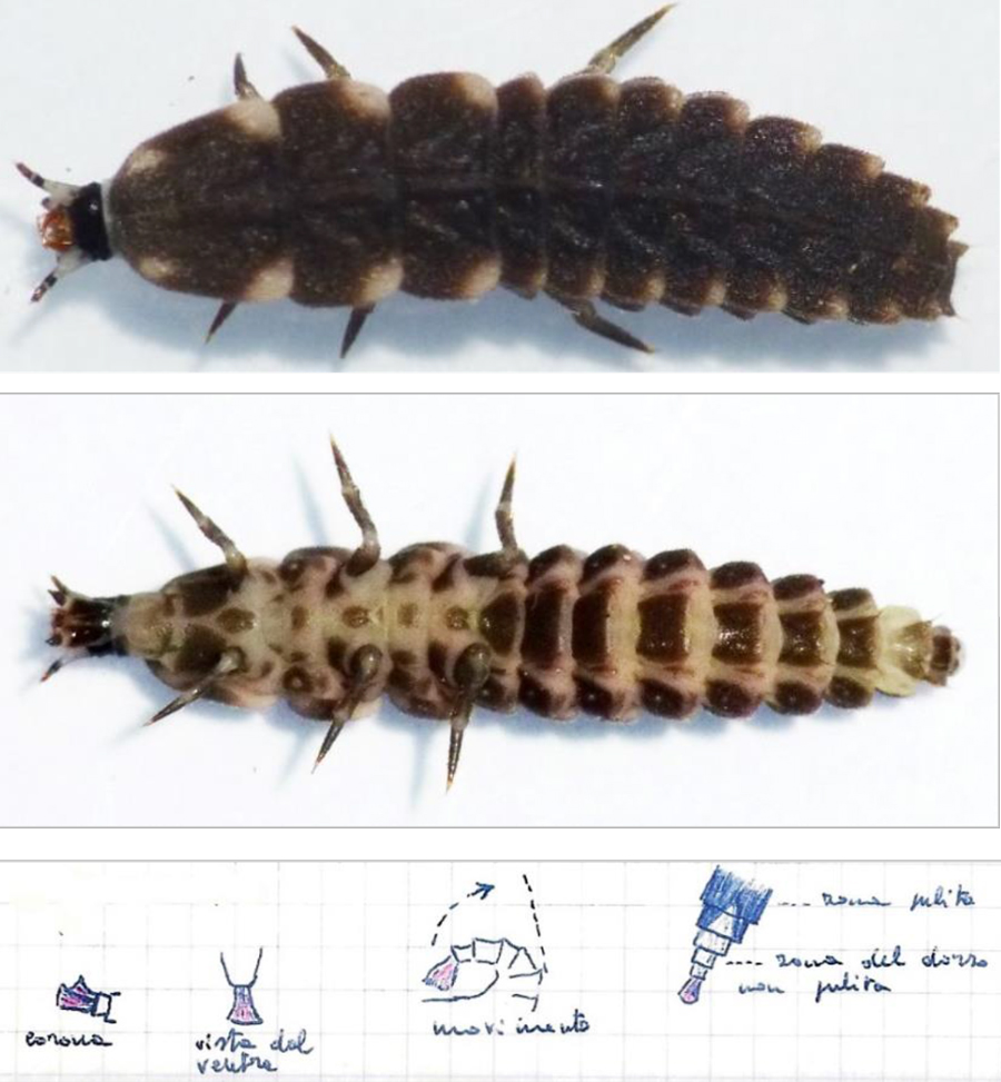 Questa descrizione l’ho scritta nel 1958 quando muovevo i primi passi come osservatore dei costumi degli insetti, in un quaderno che ancora conservo. “Lucciola (3 aprile 1958) – Fano – campagna. La larva di Lampiride [oggi la riconosco come Lampyris fuscata] possiede all’estremità dell’addome, ritirata in posizione di riposo, una corona di tentacoli mobili disposti a mezza raggera, bianchicci, rosei in fondo e simili ad un mezzo imbuto (pigopodio). Per fare toeletta inarca di lato il pigopodio e lo avvicina al segmento da pulire. Poi allunga e distende, come una mano che si apre da serrata che era, l’imbuto mobile, e con questo fa presa nella zona da pulire e poi lo richiude, strofinandolo sulla superficie del tegumento. Quindi lo ritrae, passa al successivo, riallunga l’imbuto e così via. I tentacoli fungono da spazzola, penetrano negli interstizi del tegumento e lo puliscono. L’imbuto è inzuppato di un liquido spumoso e quando lo ritrae i tentacoli si arricciano verso l’interno. La zona pulita appare umidiccia. La pulizia si ripete spesso e dura buoni quarti d’ora. I tentacoli sono lunghi 2 mm, staccati l’uno dall’altro. Il corpo è pulito e scuro solo dove può arrivare l’imbuto-spazzola, il resto è sporco di terra”.