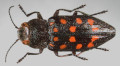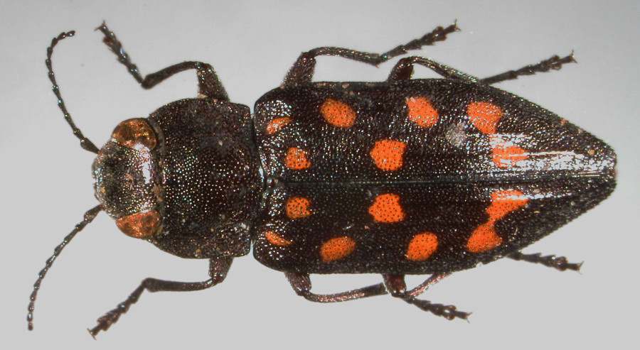 Morfologia: lunghezza 10-14 mm. Corpo allungato, depresso; capo, pronoto e elitre con fitta punteggiatura. Colore: capo e pronoto nerastri con riflessi bronzei; elitre nere, ognuna con 6 macchie di colore arancio; zampe e antenne nere con riflessi metallici. Capo più largo che lungo, peloso, finemente zigrinato; occhi molto grandi, non sporgenti, ellissoidali; antenne brevi, di 11 articoli. Pronoto più largo che lungo; margine anteriore fortemente incavato; margine posteriore sporgente ad angolo ottuso verso lo scutello; margini laterali rettilinei e paralleli, all’apice finemente denticolati, arrotondati e bruscamente convergenti; alata. Zampe molto snelle; tarsi di 5 articoli, il 4° incavato di sopra.
