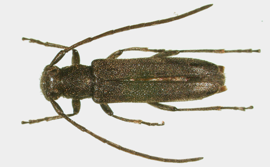Morfologia: lunghezza 8-9 mm. Corpo nero, stretto, cilindrico, finemente peloso, fortemente punteggiato. Capo largo circa quanto il pronoto; occhi divisi in due parti separate dalle antenne; antenne molto robuste, di 11 articoli, nere, lunghe circa quanto l’intero corpo, pelose e con radi lunghi peli al lato interno. Torace subquadrato, coi lati arrotondati. Zampe lunghe, nere, pelose; tarsi di 4 articoli. Elitre molto allungate, alla base e ai lati diritte, all’apice arrotondate, un po’ depresse nel centro.