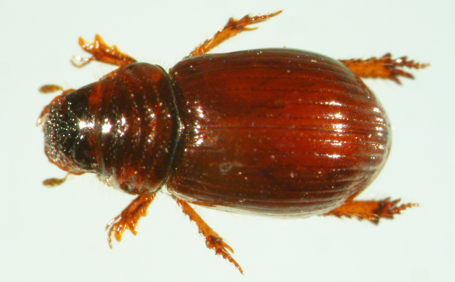 Morfologia: lunghezza 3,5-4,5 mm. Corpo subcilindrico, molto convesso, lucido, di colore rossiccio; di sopra glabro, parte inferiore, zampe e margine del pronoto setolosi; zampe, antenne e palpi giallo-rossicci. Capo più largo che lungo, alla sommità con 4 costole lisce e ottuse convergenti indietro, fronte con abbondanti tubercoli tondeggianti; parte anteriore (clipeo) con incisione triangolare; antenne molto brevi, di 9 articoli; clava pelosa, di 3 articoli. Protorace più largo che lungo, con 5 costole trasversali lisce, angoli anteriori un po’ sporgenti; angoli posteriori arrotondati; margine anteriore diritto; margini laterali crenulati nella metà anteriore; margine posteriore arcuato; margini laterali e posteriore con setole rigide e filiformi. Elitre con la massima larghezza dopo la metà, molto convesse, arrotondate all’apice, con 10 strie punteggiate poco profonde e interstrie larghe e quasi piane. Zampe robuste; tibie anteriori dilatate con 2 forti denti nel margine esterno; meso- e metatitibie con numerose protuberanze dentiformi nel margine esterno; tarsi più corti delle tibie, con 5 tarsomeri.