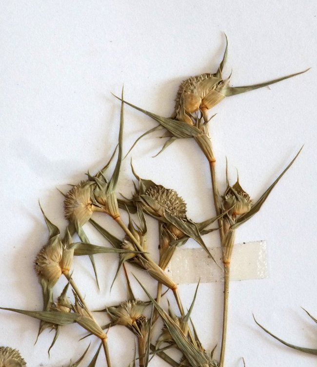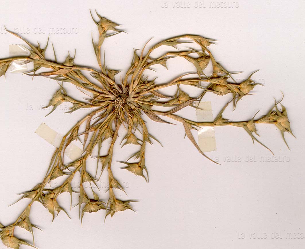Pianta erbacea annua (T scap) di 5-40 cm. Si distingue per le foglie fiorifere a lunga spina, inguainanti l’infiorescenza a capolino.