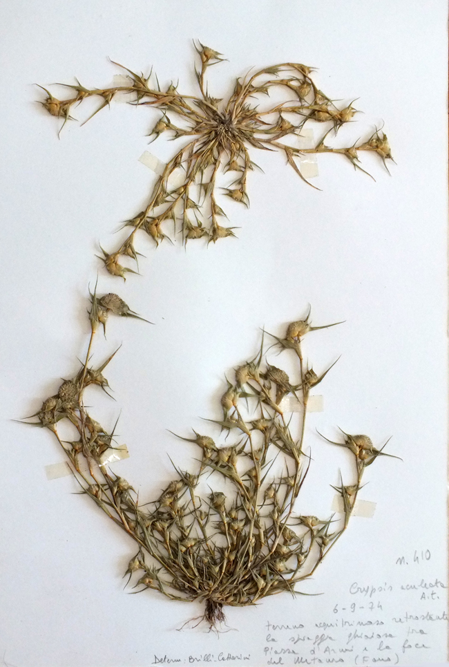 Segnalata da PAOLUCCI (1890-91), su comunicazione di Scagnetti, in stagni essiccati presso Pesaro e da BRILLI-CATTARINI (1976e) in ambienti subpalustri del litorale di Pesaro. Rinvenuta nel tratto di circa 1 km di terreno acquitrinoso retrostante la spiaggia ghiaiosa tra Piazza d'Armi a Fano e la foce del Metauro il 6 settembre 1974 - Erbario POGGIANI, determ. BRILLI-CATTARINI sub Crypsis aculeata; citata in POGGIANI (1980).