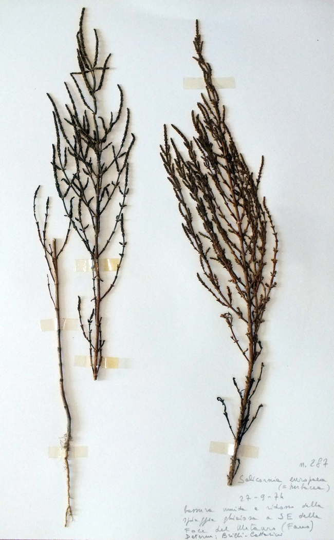 Segnalata da GUIDI (“Guida di Pesaro” del 1864, tip. A. Nobili), sub S. herbacea, per Pesaro in riva del mare e da PAOLUCCI (1890-91) sempre per Pesaro, su comunicazione di Scagnetti. Cresceva sino al 1974 nelle bassure umide, oggi scomparse, retrostanti la spiaggia ghiaiosa nel tratto da 0,5 a 1 km a NO della foce del Metauro e a 600-700 m a SE della foce; un campione raccolto il 27 settembre 1974 nella seconda località è conservato in Erbario L. Poggiani, determ. Brilli-Cattarini sub Salicornia europaea. Citata da BRILLI-CATTARINI & BALLELLI (1979), sub S. europaea, per le stesse stazioni (litorale tra il Poligono di Tiro e la foce del Metauro e in destra della foce del Metauro).