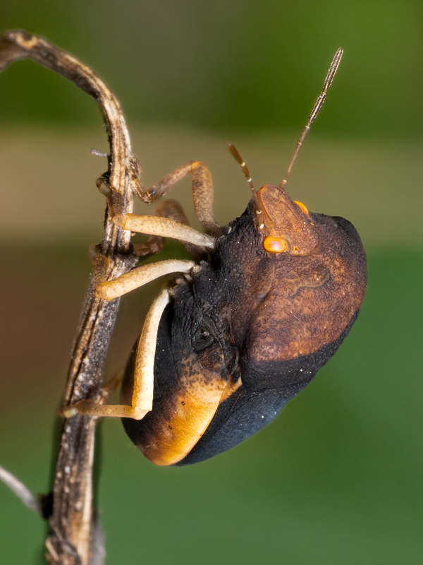Morfologia: lunghezza 8-10 mm. Come tutte le Scutelleridae, questa specie ha uno scutello che copre tutto l'addome e le ali. Corpo rotondeggiante dal caratteristico aspetto bicolore. La testa, la parte anteriore del pronoto e le zampe sono di colore giallo-arancione. Il ventre si sfuma dal giallo-arancione dei bordi verso un marrone scuro. La parte posteriore del pronoto e lo scutello sono di colore marrone-nerastro uniforme. Gli angoli omerali del pronoto sono smussati. Specie inconfondibile.