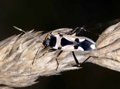 Morfologia: lunghezza 6,5-8 mm. La specie presenta delle caratteristiche macchie nere su fondo marrone chiaro. La testa e lo scutello sono neri, mentre il pronoto presenta una larga banda nera e una banda biancastra punteggiata, con due macchie nere sulle estremità. Le elitre sono marrone chiaro, con due macchie nere. La membrana è nera con una macchia bianca all’apice. I femori posteriori hanno una fila di dentelli dritti e sottili.