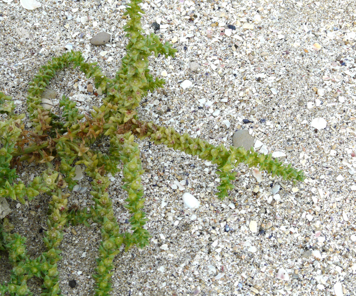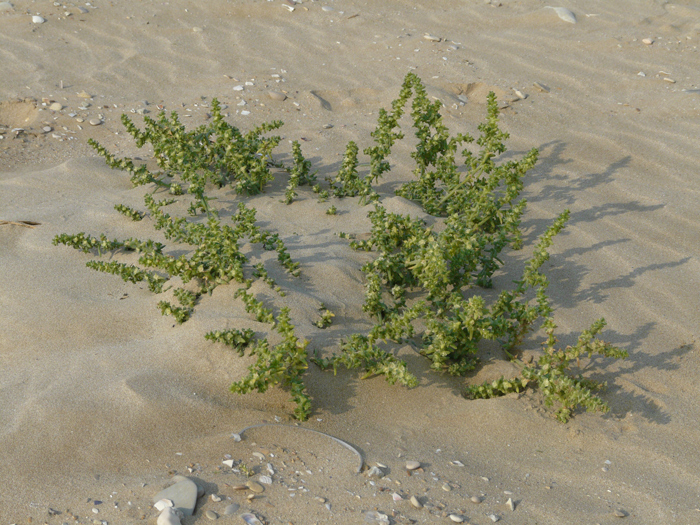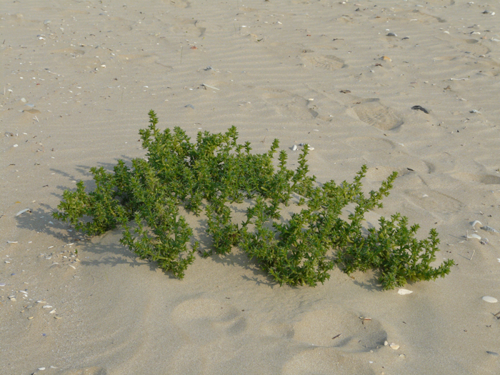 Pianta erbacea annuale (T) di luoghi salati litoranei, con foglie carnose, ad apice pungente e fiori poco appariscenti, da luglio a settembre. Forma densi cuscinetti alti 20-80 cm.