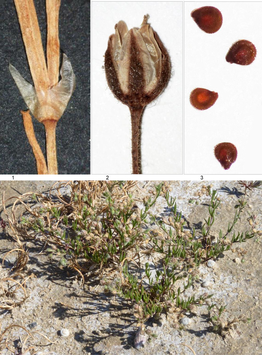 Caratteri distintivi: pianta erbacea annua (T scap) alta 5-30 cm. Foglie carnose, mucronate; rami giovani con stipole connate per circa la metà della loro lunghezza; infiorescenza glabra o glandoloso-pubescente; sepali di (2,5-)3-4(-5) mm, glabri o glandoloso-pubescenti; petali non più lunghi dei sepali; 1-6(8) stami; capsula di (3-)4-6(-6,5) mm, in genere lunga poco più dei sepali; semi sprovvisti di ala o solo in parte alati, di rado tutti alati.