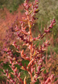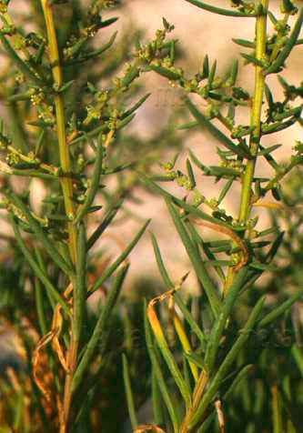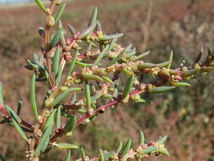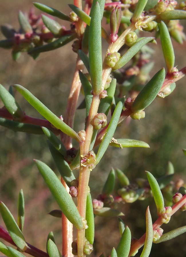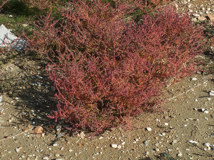 Caratteri distintivi: pianta erbacea annua (T scap) alta 20-60 cm. Foglie succulente lunghe 10-30 mm, ± acute; frutto incluso nel perianzio; semi lenticolari di circa 1,5 mm, nerastri o bruno-rossastri.