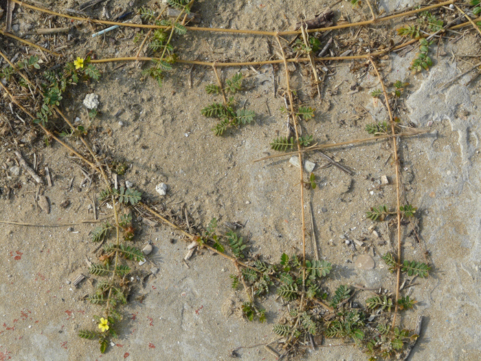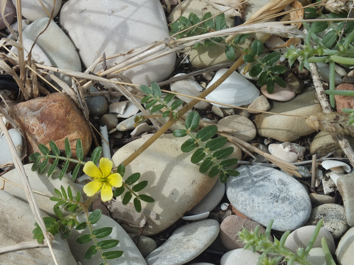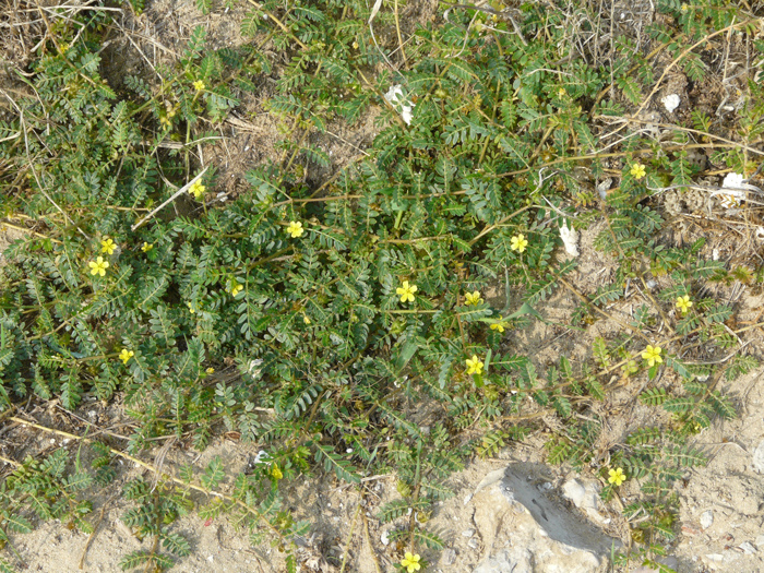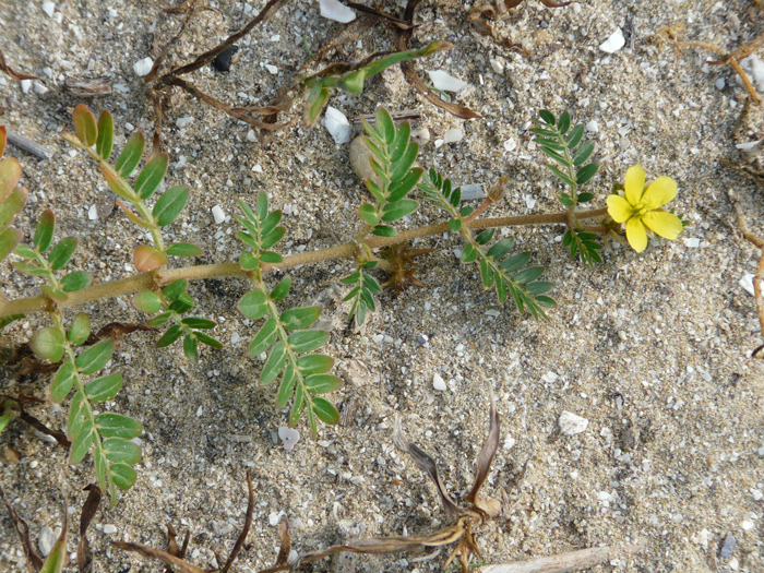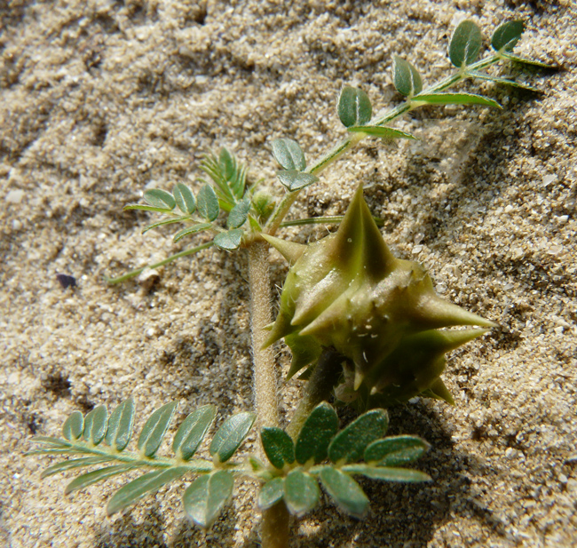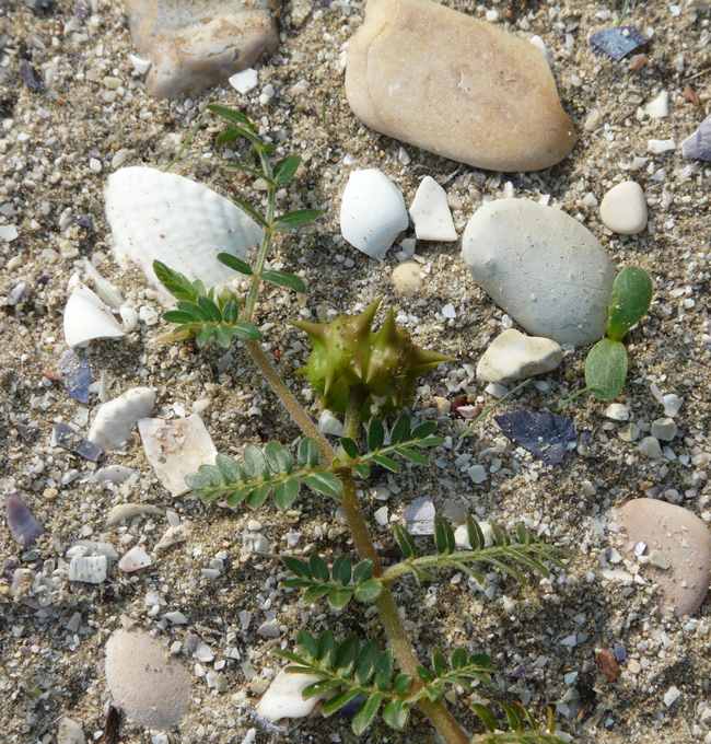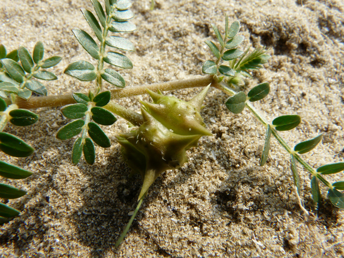 Pianta erbacea annuale (T) dei litorali sabbiosi, a portamento strisciante, con fiori gialli all'ascella delle foglie, da maggio a ottobre, e tipici frutti assai spinosi.