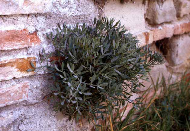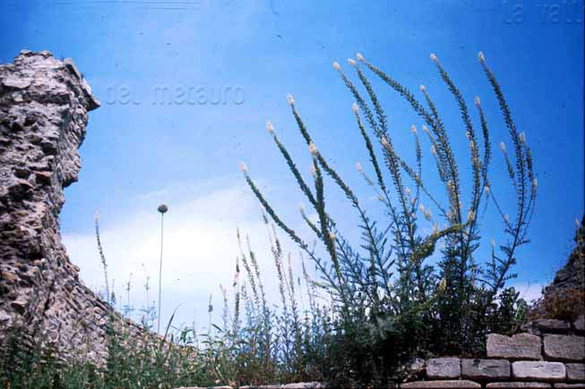Altre piante che si rinvengono a volte nelle fessure dei vecchi muri sono la felce Capelvenere (Adiantum capillus-veneris), in punti umidi e ombrosi, il Corno cervino (Plantago coronopus) e la Reseda bianca (Reseda alba), del litorale sabbioso e ghiaioso, il Critmo o Finocchio di mare (Crithmum maritimum), delle rupi esposte al mare e del litorale ghiaioso (osservato sulle mura di Fano e di Novilara), il Porradello (Allium ampeloprasum), pure presente lungo il litorale, l'Enula vischiosa (Dittrichia viscosa), piccolo arbusto frequente negli incolti e nei ghiaieti dei fiumi, l'Iperico (Hypericum perforatum subsp. angustifolium), l'Elicriso (Helichrysum italicum), il Caccialepre (Reichardia picroides), la Costolina annuale (Hypochaeris achyrophorus), la Moscatella minore (Salvia verbenaca), la Nepetella (Calamintha nepeta), la Violaciocca (Matthiola incana) e infine rampicanti legnosi come l'Edera (Hedera helix), il Rovo comune (Rubus ulmifolius) e la Vitalba (Clematis vitalba), comuni sia nei boschi e le siepi che sui ruderi. Tra le specie arboree più frequenti ricordo il Fico (Ficus carica), il Pino d'Aleppo (Pinus halepensis) e l'Ailanto (Ailanthus altissima).