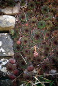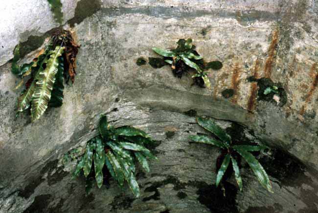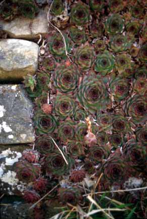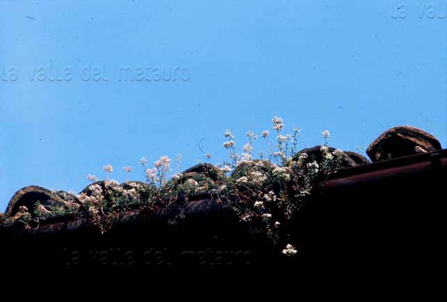 Sui vecchi muri e i tetti dei centri di montagna possono trovarsi il Semprevivo (Sempervivum tectorum), l'Agnello grasso (Sedum dasyphyllum), a fiori bianchi, e specie denominate genericamente Erba pignola, con fiori gialli: il Sedum acre, il Sedum rupestre e il Sedum sexangulare. Tra le Felci ricordo la Lingua cervina (Asplenium scolopendrium), l'Erba ruggine (Ceterach officinarum), la Ruta di muro (Asplenium ruta-muraria) e l'Erba rugginina (Asplenium trichomanes).