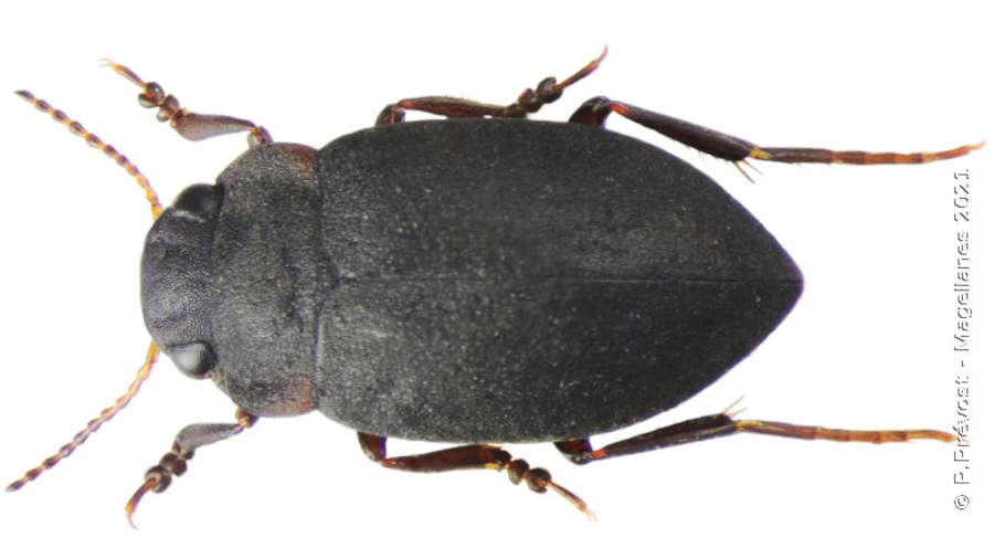 Morfologia: lunghezza 4,4-5,3 mm. Corpo piccolo, allungato, coi lati arrotondati, ma al centro quasi rettilinei, debolmente convesso di sopra, convesso di sotto, massima larghezza circa alla metà; nel profilo laterale è molto evidente una forte incavatura fra la base delle elitre e la base del pronoto; superficie superiore molto opaca, fittamente punteggiata sulle elitre, con pelosità, su pronoto ed elitre, molto fitta, brevissima e aderente. Colorazione generale: nerastra; palpi rossastri; antenne coi primi 4 articoli rossastri e i rimanenti scuriti. Capo: largo e appiattito, glabro, arrotondato, di aspetto molto opaco e ruvido, ai lati con 2 debolissime e larghe depressioni; scultura formata da abbondanti punti sottili; occhi piccoli e molto convessi nel profilo laterale; antenne snelle. Pronoto: molto largo, convesso al centro, spianato ai lati, ruvido sotto l’indumento; margine anteriore quasi diritto, ai lati fortemente sporgente verso gli occhi; margini laterali regolarmente arrotondati, poco ristretti verso l’avanti e senza bordo evidente; margine posteriore coi lati rettilinei e al centro sporgente verso le elitre. Zampe: lunghe, snelle e robuste, poco adattate al nuoto; tarsi di 5 articoli; gli anteriori e i medi apparentemente provvisti di soli 4 articoli in quanto il quarto è contenuto nella smarginatura del terzo. Elitre: allungate, poco convesse, con massima larghezza circa alla metà, ruvide e minutamente e fittamente pelose, coi lati quasi paralleli al centro e molto ristrette all’apice; punti molto abbondante, grandi e poco profondi. Dimorfismo sessuale: non evidente.
