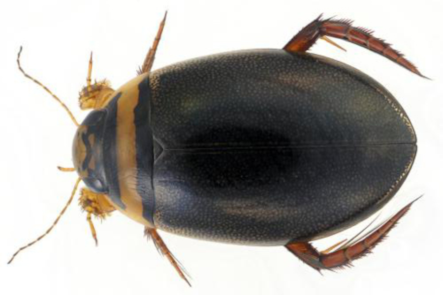 Morfologia: lunghezza 13,5-15,2 mm. Corpo largo, ellittico, con la massima larghezza dopo la metà delle elitre, egualmente convesso sopra e sotto; sopra spianato lungo la linea mediana; superficie superiore di aspetto lucido; microscultura costituita da numerosi punti più grandi frammisti a fittissimi e minutissimi punti. Colorazione generale: di sotto rossastra, di sopra bruno-nerastra; capo giallo-rossastro con disegno nero fra gli occhi e 2 macchie giallo-rossastre sul vertice; antenne giallo-rossastre, più scure verso l’apice; palpi giallastri; pronoto giallastro con una fascia nera al margine anteriore e un’altra al margine posteriore; elitre bruno-nerastre con ampio margine laterale e fittissime e piccolissime macchie rotondeggianti che coprono tutta la superficie. Capo: largo e poco convesso, con occhi molto sporgenti; antenne filiformi con articoli molto allungati. Pronoto: molto largo e convesso, margini laterali senza orlo e fortemente arcuati; margine anteriore punteggiato, molto più stretto del posteriore e debolmente convesso verso il capo; margine posteriore con punti più radi e quasi rettilineo; tutta la superficie con numerosi brevi solchi paralleli disposti prevalentemente in senso longitudinale. Zampe: un po’ corte; tarsi di 5 articoli; unghie delle zampe posteriori molto diverse: le interne lunghe fino al doppio delle esterne. Elitre: corte, arrotondate ai margini, con la massima larghezza dopo la metà; sono presenti 4 strie di punti di cui le 2 interne con punti più grandi e molto più radi; margine laterale con una stria di setole lunghe e rade verso l’apice elitrale. Dimorfismo sessuale: nel maschio 3 primi articoli dei tarsi anteriori fortemente dilatati e formanti, nel complesso, una struttura discoidale munita di setole e ventose; 3 primi articoli dei tarsi mediani debolmente dilatati e con suola di setole.